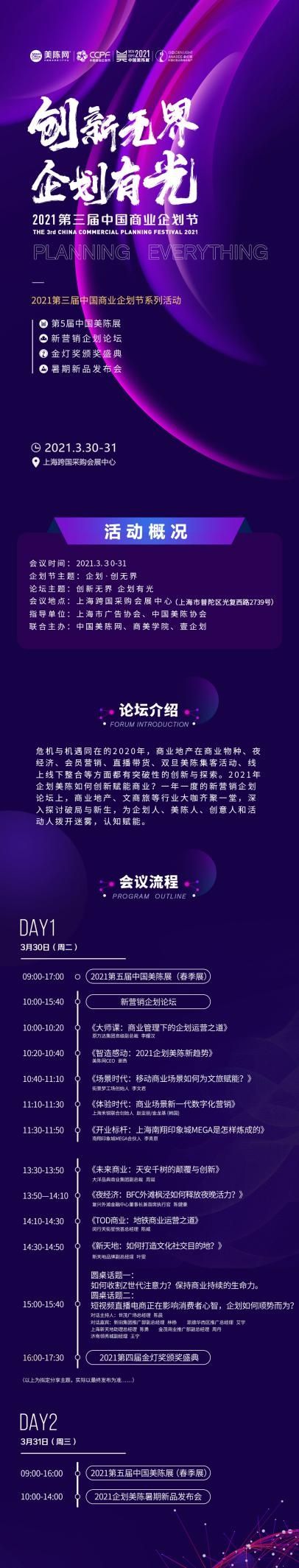 在“创新无界·企划有光”主题新营销企划论坛上,与商业地产、文商旅、百货零售、连锁品牌等各界大咖齐聚一堂,共同聆听行业专家分享他们的真知灼见以及富有远见的主题演讲。Day1(3月30日),美陈网会发布令人期待的《2021企划美陈趋势发布》,和嘉宾们围绕着企划人美陈人关心的选题,记录时代声音,洞悉行业趋势。还有来自快闪运营、社区商业、夜经济、策展零售等领域的杰出商业人的精彩分享,为大家拨开迷雾,认知赋能。来自各大商场的杰出企划人将以“如何收割年轻人注意力?”和“短视频直播”为话题进行圆桌对话,深入探讨破局与新生。