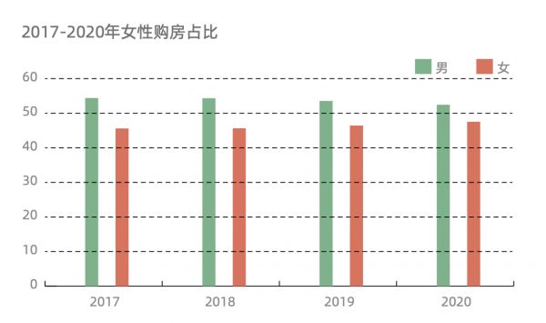 报告显示,2020年女性购房者比例已经达到47.5%,为近年来最高点,在一二线城市“筑巢引凤”式的楼市需求正在改变,“她购房”成为一种趋势。虽然从存量上看,性别差异并未消弭,但女性群体进入房地产市场的加速度正在弥合差距,且有后发制人之势。
