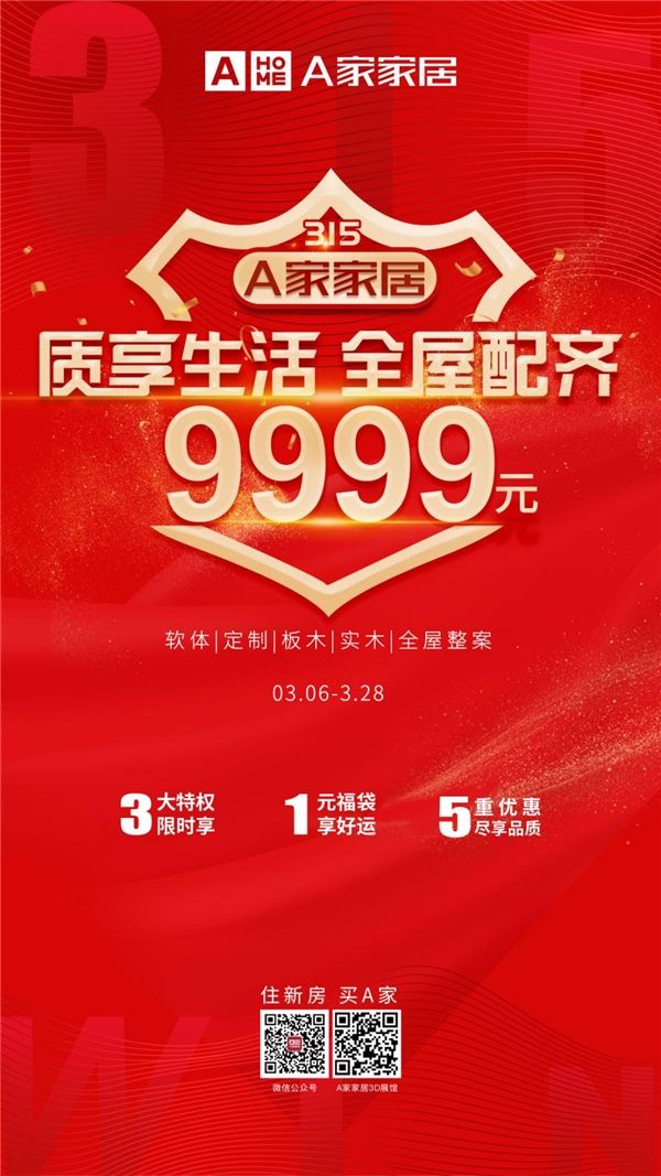 A家家居质享315活动正在终端门店火热进行中,全屋配齐9999元套餐欢迎抢购,更有【3大特权限时抢】【1元福袋享好运】【5重优惠 尽享品质】等优惠活动等你来购。3月6日-28日,我在A家家居门店等你!