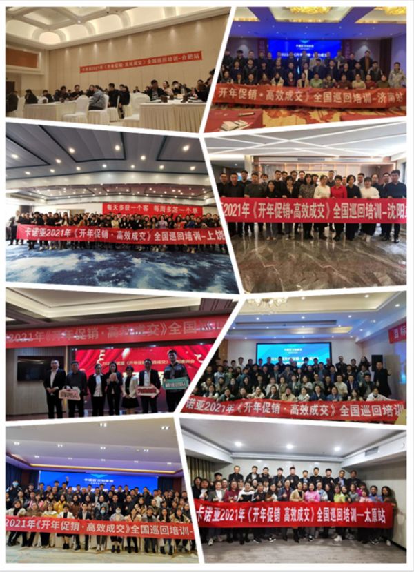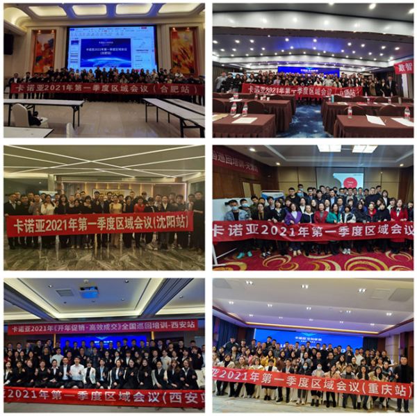 据悉,卡诺亚定制家居2021年第一季度区域会议暨开年促销高效成交全国巡回培训,分别在沈阳、西安、天津、太原、重庆、广州、长沙、武汉、郑州、济南、上饶、合肥等近20个城市圆满举行。