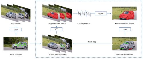 另一项研究由KooLab与湖南大学、上海科技大学、美团等共同提出了一种适用于自然场景下的交互式视频目标分割框架。通俗的讲,是通过强化学习框架,让智能体学习如何推荐视频关键帧,这项研究让AI技术大幅减轻人工标注成本。