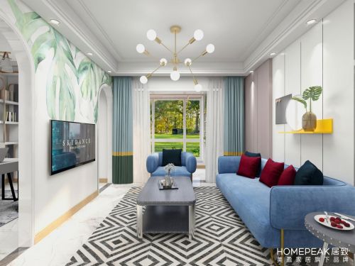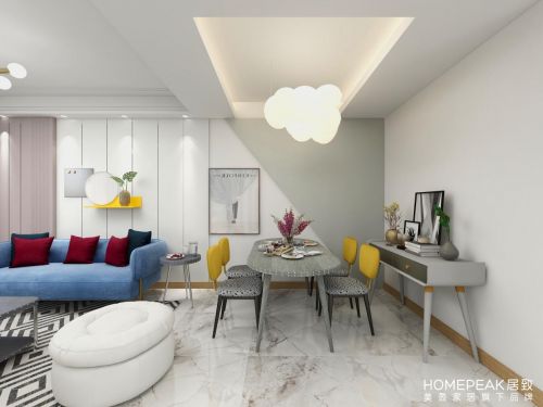 琉璃蓝布艺沙发,搭配玫红色的抱枕,呈现一冷一暖的互补效果,碰撞出奇异的视感美。搭配灰色的现代茶几、角几,柔化了强烈色彩带来的视觉冲击,同时也保留着对比性的视觉张力效果,呈现出青春活力的氛围。乳白色的单人软包沙发,以云感的柔软体验,洁净利落的设计,带来触觉的惊喜与视觉的享受。