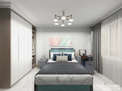 舒缓的灰白色作为房间的主色调,提供一个宁静的睡眠空间。少量的千草色,作为点缀色出现于床具,赋予空间清新的现代简约气质,而不失空间亮点。