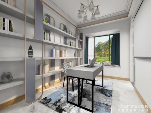 黑白灰构筑的简约书房空间,因金铜色的线条刻画,变得质感十足且更有条理。书桌采用硬朗的金属材质,理性的线条勾勒出时尚前卫的格调,闪烁的银色光泽,展现低调的轻奢范。千鸟格作为时尚界的经典元素,运用在书椅设计上,打破书房的刻板印象,彰显不俗的品位。