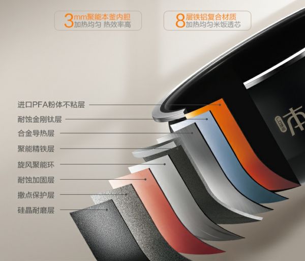 消费者想知道美的和苏泊尔电饭煲哪个好,也可以从电饭煲的内胆入手来做出选择。苏泊尔电饭煲的内胆也有诸多可圈可点之处。苏泊尔专注内胆技术已有20多年的时间,苏泊尔深知对于电饭煲来说,内胆犹如心脏,好胆也是煮出好饭的关键。经历了从铝合金内胆、陶晶内胆、聚能不锈钢内胆、球釜内胆、钛球釜内胆,一直到如今的本釜内胆,苏泊尔致力于不断引领电饭煲内胆技术的变革。这款远红外电饭煲采用了8层复合材料厚釜,厚达3mm 的聚能厚釜由加固保护层、聚能层、导热层、耐蚀层、粉体不粘层组成,聚能导热,更加耐用。