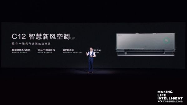 TCL 智慧新风空调作为TCL灵悉C12的一员,携行业领先的新风技术重磅亮相发布会。