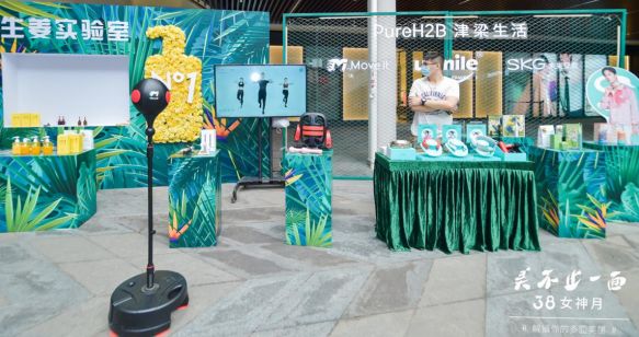 妆容精致美妆区,专业美妆老师打造个性妆容,让每一个女生发现自己的另一面;护肤区让大家了解自己的皮肤状况,选择更合适的护肤方法;让大家倍感好奇的是生姜实验室,将专业工厂研发的护发精华按照1:5比例调配,再加入新鲜榨取的生姜,摇匀即可得到一瓶纯天然的生姜护发素,女神们纷纷化身实验小能手,感受实验乐趣;3c运动区大家体验趣味健身游戏,感受运动的魅力;香氛区则是翻转香氛卡片,解锁自己的独特香气;最后茶饮区是由津梁生活联合Swisse献上特制的女神特饮。