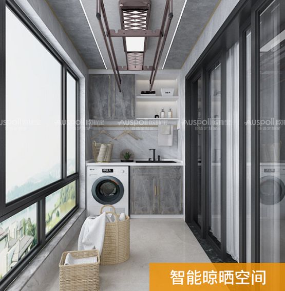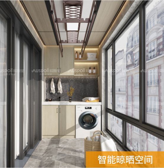 欧斯宝全功能阳台以“让家多一个空间”为设计理念,定位于功能生活阳台,在满足洗衣晾晒的基础上,通过整合大板吊顶、照明系统、集成墙面、智能晾衣机和阳台柜等产品,实现阳台功能的合理划分,如洗漱区、收纳区、书房、休闲区等,提高空间利用率,使美观度、整体协调度更高。