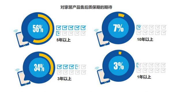 另外,在不了解产品品质的情况下,产品质保时间久无疑是给消费者吃了一颗“定心丸”,能够让消费者心甘情愿为之买单。《洞察报告》显示,消费者对于延长产品质保年限的呼声颇高。经过对商场家居品牌门店了解发现,一些家居品牌用质保5年、10年乃至30年,来证明产品品质经得起时间检验。质保时间越长让消费者越安心,但能达到消费者期望质保年限的家居品牌却也寥寥。通过《洞察报告》可以发现,调查样本中一半以上(55.62%)的消费者期待家居产品的售后质保期能够延长至5年,但实际上我国家具的质保期通常为一般品牌是1年,知名品牌是3年,部分知名品牌可达到5年,而木作类家具的保修期通常为2年。这与当下市场期望明显不符。