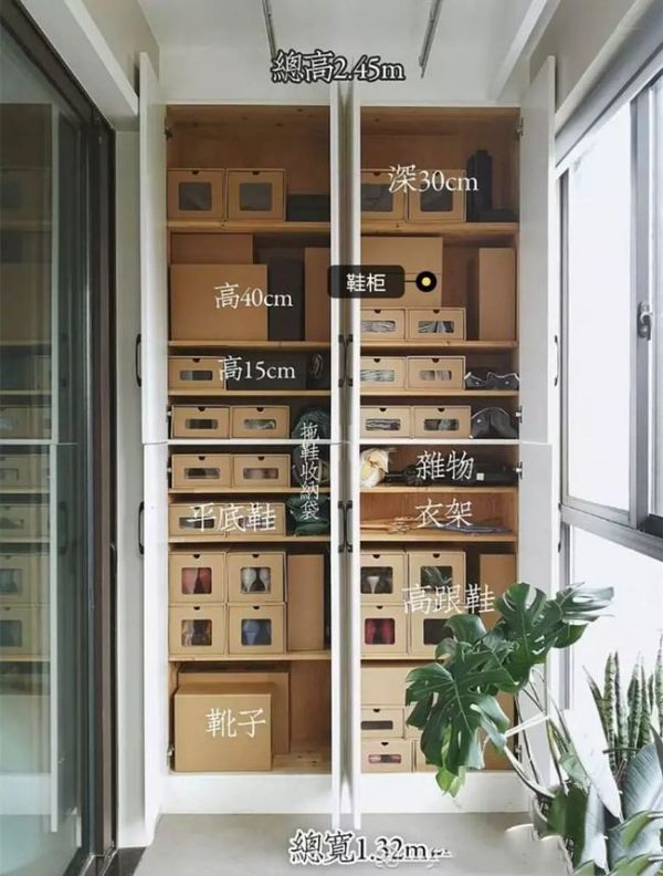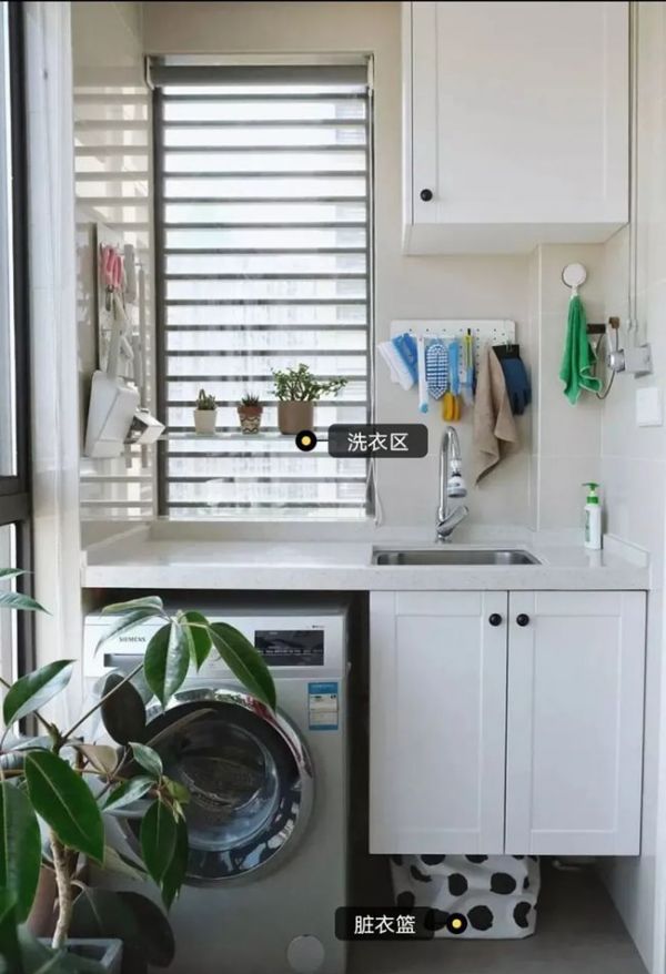 阳台一分为二,一半用作收纳,另一半用作洗衣区,同时将收纳柜用隔板划分出不同区域,并且根据放置物品进行不同尺寸设计,方便了物品摆放又保持了整洁。大家可以参照上图尺寸哦!