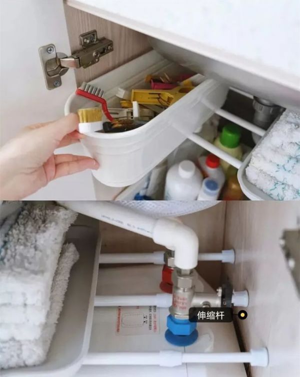 洗手盆底部可以利用伸缩杆及收纳盒的搭配,提升储物功能,日常清洁小工具也有地方摆放。