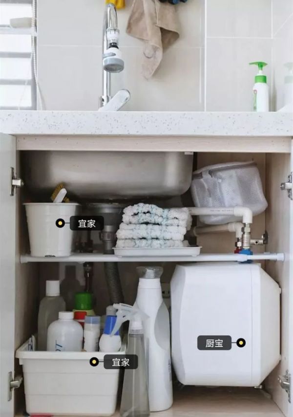 台盆下面则是利用伸缩杆划分为两部分,怎么收纳储物空间。