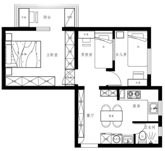 先来看看本案的户型图,在原来的客厅中间设置了一面墙,从而隔出了两间卧室,确保女孩和男孩都有相对私密的空间。虽然没有了客厅,却完美解决了二胎家庭卧室不够的问题。
