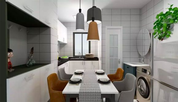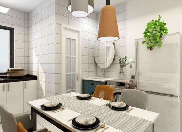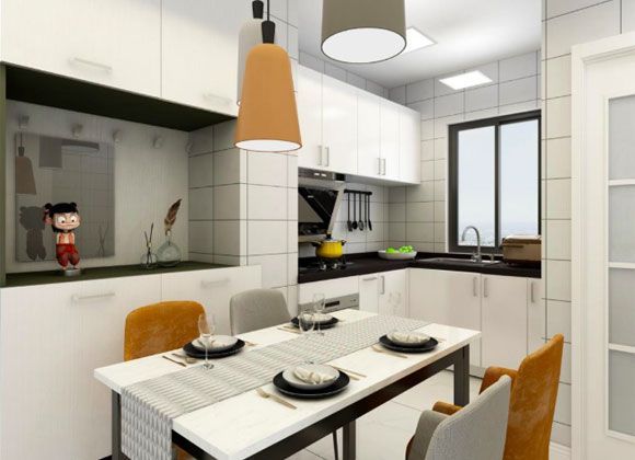 进门就是餐厅和开放式厨房,整体以白色为主来设计,避免因色彩过深让空间变得阴暗。在餐桌一侧的墙面定制了一组储物柜,解决部分家居物品的收纳问题。