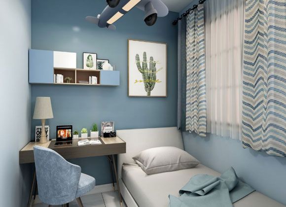 男孩房的装修以蓝色调为主来设计,两间儿童房中间的隔墙上安装了玻璃窗,增加了室内的采光。