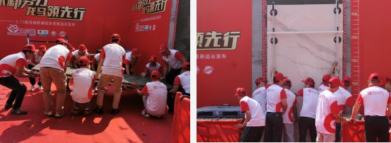 为了让现场嘉宾与线上观众更加直面了解本次发布会新品,龙马防水工作人员还在发布会现场直播施工,现场展示了规格为1.6M*3.2M世界级超大板贴砖工艺技术流程。据慧正资讯观察,龙马防水副总裁卢鸿升、副总裁卢培鸿、零售事业部总经理廖国青、首席技术应用工程师钟方平等先为大板砖揭幕、在背面题词,让施工师傅直接于镜头前用瓷砖胶将所题之词覆盖,从准备工作到完成完美粘贴仅有半个小时,可以看出使用M702大板瓷砖背胶施工确实简便,粘贴后的大板钻拥有超强粘结力,并且薄贴省空间,上墙后的大板砖没有丝毫滑移,使大板真正实现了柔韧性、粘结强力与收缩率三者合一。