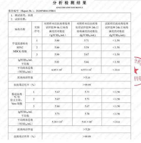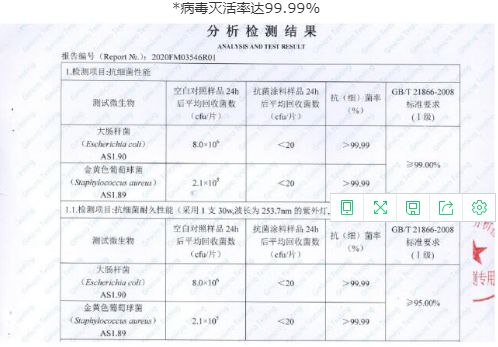 经国内权威微生物检测机构分别对产品抗病毒性能和抗菌性能进行了严苛检测,其实验数据表明,臻天然抗病毒无机矿物涂料对甲型流感病毒(H3N2)、肠道病毒71型(引起手足口病的一种病毒)、大肠杆菌、金黄色葡萄球菌等病菌具有99.99%的超高灭活率,属于可检测的最高级别杀灭率,相较其它普通的装修涂料,该产品拥有更稳定更出色的抗病菌功效。