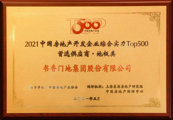 3月16日,2021 中国房地产TOP500 测评成果发布会暨房地产高峰论坛在上海召开,大会隆重揭晓了“2021中国房地产开发企业综合实力TOP500”、"TOP500首选供应商服务商品牌"等系列测评榜单及奖项。书香门地集团股份有限公司凭借突出的品牌价值和强大的品牌影响力,连续八年蝉联“中国房地产开发企业综合实力TOP500首选供应商·地板类”。