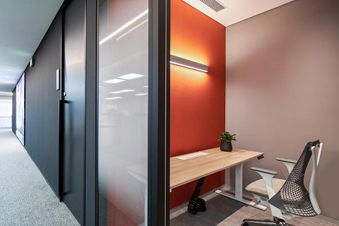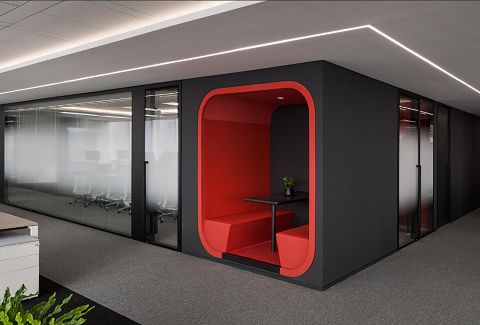 在办公区旁,设置了小型的包厢座椅,让相对严肃的办公区转变为较为开放的区域,可以让员工进行快速的沟通。包厢座椅除了采用主调色黑色外,还添加了红色,红色代表着激情,斗志和革新,与奔驰公司的格言“创新的激情永不灭”完美匹配,HTM设计师善于将企业文化、底蕴融入到设计之中,使整体的设计得到提升,可以用颜色来表达的设计,从不会多添加多余的元素。