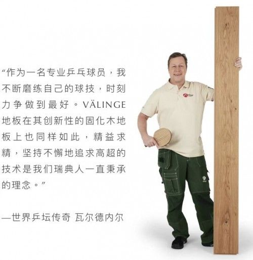 “正如我们的 VÄLINGE 地板改变了人们对实木地板的认知一样,瑞典乒坛传奇瓦尔德内尔不但球技高超且极具敏锐的创新思维,而这也是我们公司一直秉承的价值观和对待产品的态度”,威林格销售总监Jarl Gunnarsson 评论道,“与瓦尔德内尔的合作是我们向亚洲市场正式推出 VÄLINGE 新一代实木地板的第一步”。