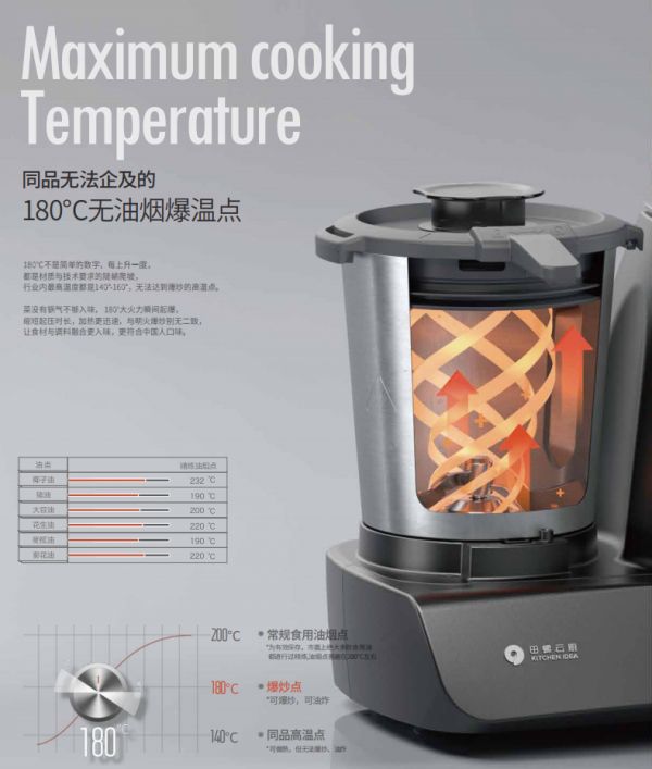 不同于其他厨电品牌单纯地进行产品展示,田螺云厨的展台在不断飘出的饭菜香味中显得格外热闹。“但闻菜香,未见油烟”,是田螺云厨之所以能够在展台烹饪的原因。我们都知道,做菜的时候当温度达到一定数值,食用油便会产生有害的油烟,一般来说日常食用油的起烟点在200℃左右。而田螺云厨AI无油烟烹饪机器人则通过37-180℃的精准控温,把油温始终控制在不起油的温度范围中。精准控温还给AI无油烟烹饪机器人带来10档火力的优势,煎、炸、蒸、煮都通过精确的数据调控,将食材的风味完美呈现。