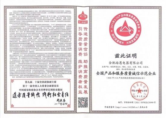 “全国产品和服务质量诚信示范企业”每年评选一次,培恩自2016年成功取得这张“金名片”以来,已经连续6年顺利通过评选,实现了“六连冠”!荣获这样的认可,是对培恩多年来重视企业信誉和产品质量的最好表彰。