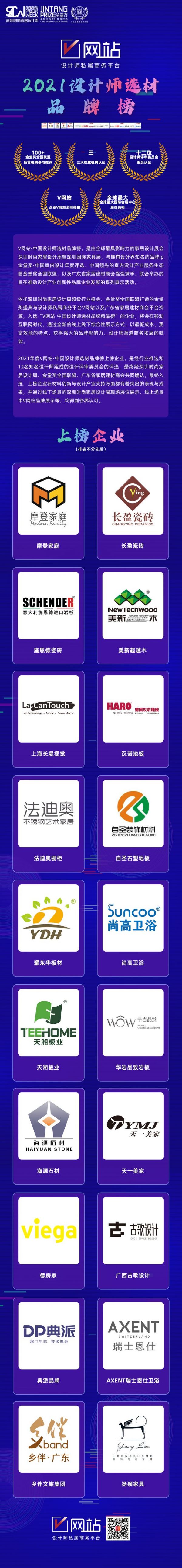 V网站·设计师选材品牌榜是由金堂奖全国联盟、深圳时尚家居设计周、广东省家居建材商会共同联合发起举办,基于金堂奖全国联盟打造的产业级互联网产品设计师私属商务平台V网站,立足在深圳国际会展中心重大发布的深圳时尚家居设计周主场,整合金堂奖全国联盟、广东省家居建材商会、深圳时尚家居设计周三方产业资源,旨在发掘极致创新的优秀材料商及设计产业服务品牌,经全国设计师与机构组织推荐自荐、专家设计师组成评审委员会评选后,推荐给中国设计师业务需求的推荐品牌榜。