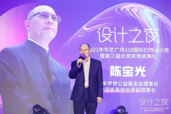 未来梦想公益基金会理事长、中国家具协会原副理事长陈宝光上台致辞,他向大家分享了他参与了三届的灯饰设计周的感想,这次来到古镇更是充满着各种惊喜。不仅看到了很多耳目一新的展示空间和灯具产品,更重要的是看到了灯饰行业在设计周、光筑奖等一系列活动推动下激活创新设计、取得突飞猛进的进步和发展。最后,他向中山的灯饰行业说出了由衷的肺腑之言:“上帝在创世纪的时候说要有光,我已经看到了古镇灯饰未来的光!”