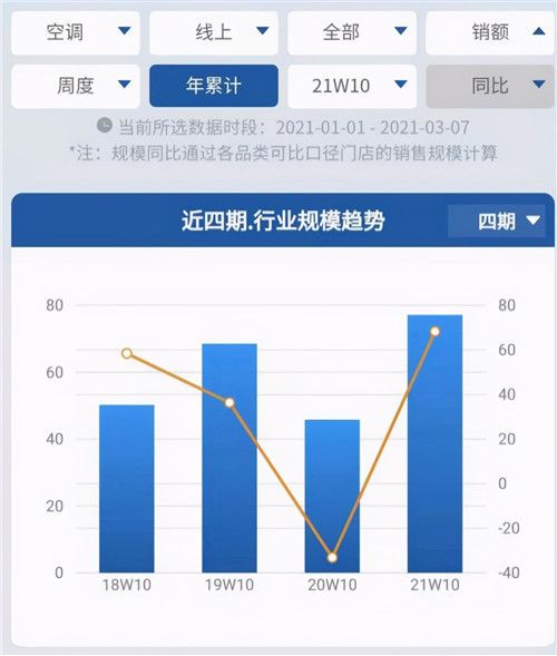 据AVC数据显示,截止到3月14日,国内空调行业线下市场规模同比上升81.47%;截止到3月7日,国内空调行业线上市场规模同比上升68.31%,且创造了近几年同时段最大涨幅。
