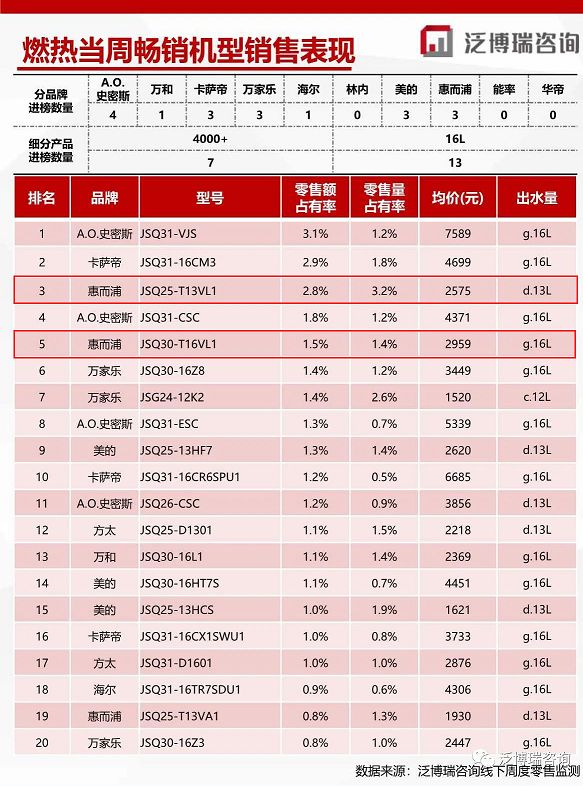 另外,泛博瑞咨询公布了燃热当周畅销机型榜单,惠而浦燃气热水器VL1系列双双入选TOP5。具体来看,这一系列产品拥有13L和16L两个规格,均支持智能APP控制,拥有3种零冷水模式——单次+定时+全天,真正实现“全时零冷水”;自适应智能增压技术更是让水量在无形中增加80%,带来专属瀑布浴的舒爽体验。