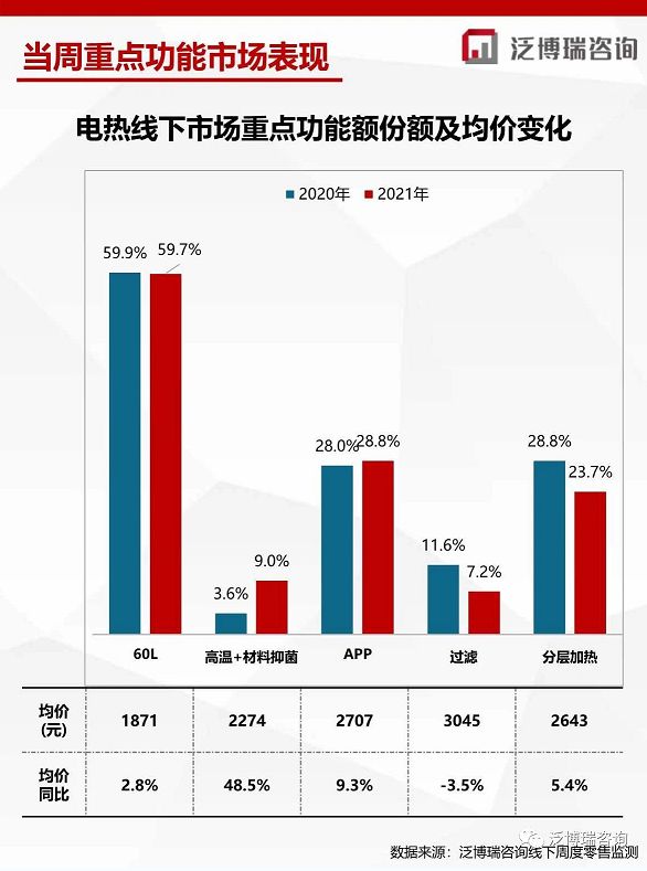 从泛博瑞咨询的周报数据中,还可以看到电热水器线下市场重点功能份额及均价变化;60L产品是市场主流,高温+抑菌材料的市场份额同比上涨5.4%、均价同比上涨48.5%。可见,60L容量且具有健康抑菌的电热水器更符合当下消费者的需求。