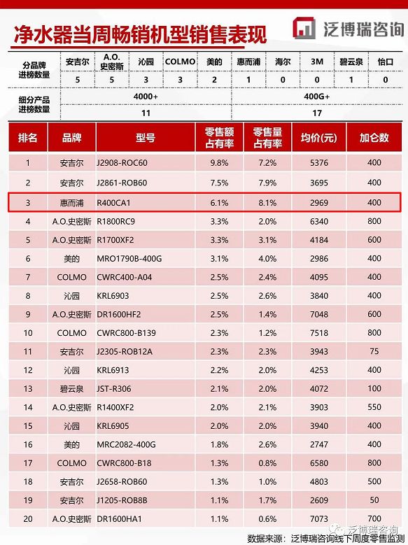 近日,泛博瑞咨询发布了《2021年线下周度销售简报》。数据显示,2021年第14周,冰洗空、热水器、净水器等家电的均价呈现同比上涨趋势,并公布了多个品类的线下畅销机型TOP榜单。百年惠而浦凭借过硬的产品实力,以及416平价超品日“不涨价”的承诺,在空调、 热水器、净水器等品类中均取得了不俗的成绩。其中,惠而浦燃气热水器VL1系列入选线下销量榜TOP5,惠而浦反渗透净水机R400CA1的市场份额进一步提升,跻身TOP3。