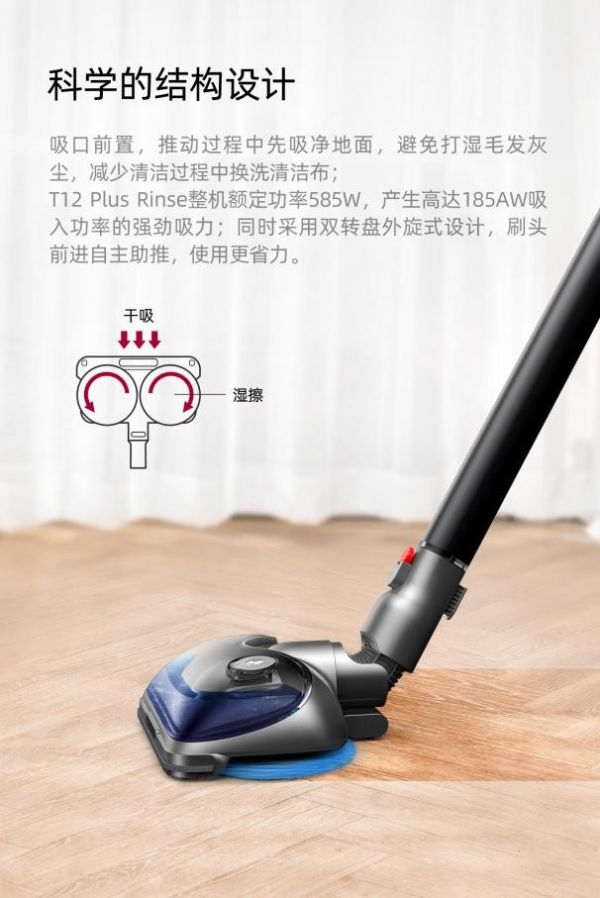 舒适优雅的生活背后需要大量的深度清洁工作,因此,人们也需要高效的清洁神器为自己减轻家务负担。小狗T12 Plus Rinse擦地吸尘器就是这样一款高效全能的产品。吸擦一体设计较传统吸尘器、吸拖一体机具有能擦地、擦地更干净的优势。创新设计的旋转擦地刷结构设计更合理,吸口前置,推动过程中先吸净地面,减少清洁布接触脏污,减少频繁洗换清洁布的次数。再采用双转盘外旋式设计,220转/分钟高速运转,不仅擦地力度强,还能形成前进助推力,使用起来非常省力,真正发挥擦地吸尘器吸尘、擦地二合一的作用,污渍一擦而净,给用户更洁净的地面清洁体验。