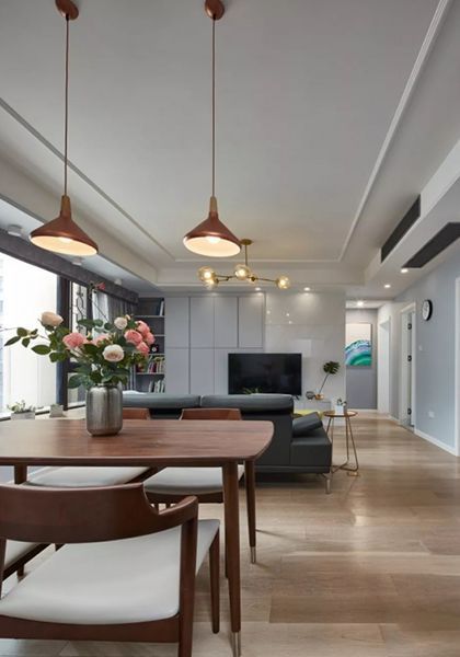 若是没有风水上的忌讳,这是最常见的设计方式,根据沙发摆放的位置将空间分隔开来。沙发居中,直接在沙发后方布置餐桌椅,这也是横厅户型中比较常见的布置方案。