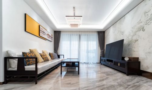 如果客厅采用新中式风格,那么,简一大理石瓷砖希腊灰的灵动写意则是一种更完美的存在。它的流纹注重营造空间的开阔感,然而水云石瓷砖的色调更像是空间温润的底色,内敛深沉、矜持冷静,让整体风格更显轻盈、婉约典雅、恢弘大气。