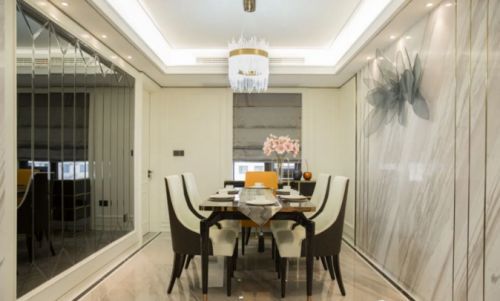 暖灰色调总会给人带来干净舒缓的感觉,将它用在进餐环境中再恰当不过。而在餐厅空间中,具有密缝连纹自然美感的简一瓷砖,配以色调和谐的软装进行点缀,现代的极简轻奢呼之欲出。