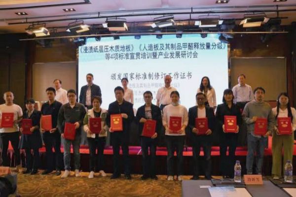 4月26日,由全国人造板标准化技术委员会、全国林业生物质材料标准化技术委员会、中国林业科学研究院木材工业研究所、林业产业标准化国家创新联盟、浙江省湖州市南浔区人民政府主办、大卫地板协办的《GB/T 18102-2020浸渍纸层压木质地板》《GB/T 39600-2021人造板及其制品甲醛释放量分级》等4项标准宣贯培训暨产业发展研讨会在南浔召开,大卫研发检测部总监喻立春应邀出席大会并致辞,大卫地板获颁国家标准制修订工作证书。