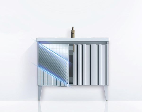 除此之外,在实用性方面,拥有3D触感、防霉特性的木合金浴室柜,柜体面板选用了航天铝合金复合材料,造就了木合金浴室柜优越的防水、防潮、耐腐蚀性能,能轻松应对卫浴间高频次水汽侵袭。六边形铝蜂窝芯板填充的柜体,让柜体更加稳固不易变形,让卫浴空间在耐用的同时,更符合人居生活。不仅如此,在360°多功能镜柜里,也暗藏新天地,拆解组合,让空间划分不同区域,更具收纳实用性。