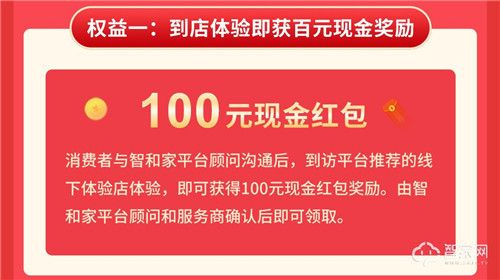 据悉,在“全民智能家居节”活动月期间,消费者与智和家平台顾问沟通后,到访平台推荐的线下体验店体验,即可获得100元现金红包奖励。(由智和家平台顾问和服务商确认后即可领取。)