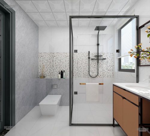 大白简约的设计搭配木色的柜子。两者的配色相辅相成,浴室里,星星点点的设计,不仅没有感觉到繁杂,更为突出了灰色的高级感,犹如夜空的繁星,点亮了整个空间。