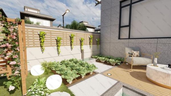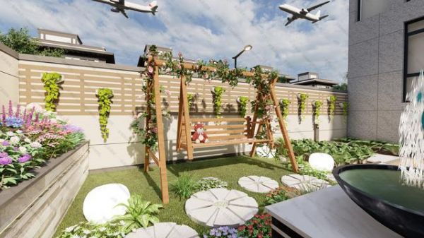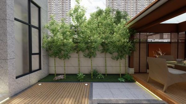靠墙种植一排竹子,有节节高升的寓意,在夏季时,降温又降噪,草坪上点缀几株植物,绿意盎然。靠墙修建花坛,花坛中种满靓丽的花卉,种类丰富,花开时满院飘香,能够让人心情愉悦。