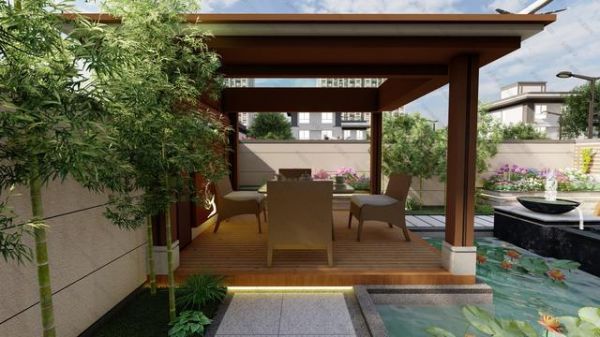 优雅的木质铺装搭配现代软质座椅,享受好的生活品质,在此处赏花喂鱼,体验后院的独处静谧时光,这样的氛围你不想来体验一下吗?