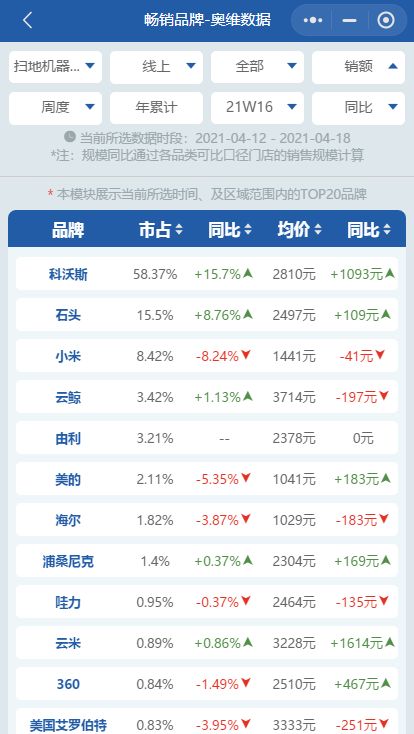 据奥维云网(AVC)线上监测数据显示,截止2021年4月,科沃斯、石头、云鲸、Uoni由利凭实力稳居行业TOP5位置,其市占比分别为58.37%、15.5%、3.42%、3.21%,合计市场占有率高达80.5%。显然,市场的主要的驱动力逐渐由产品过渡到消费者需求,而清洁力和智能化表现的提升,不仅是智能扫地机器人产品长期保持生命力的保障,更是其走进千家万户的敲门砖。