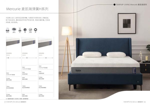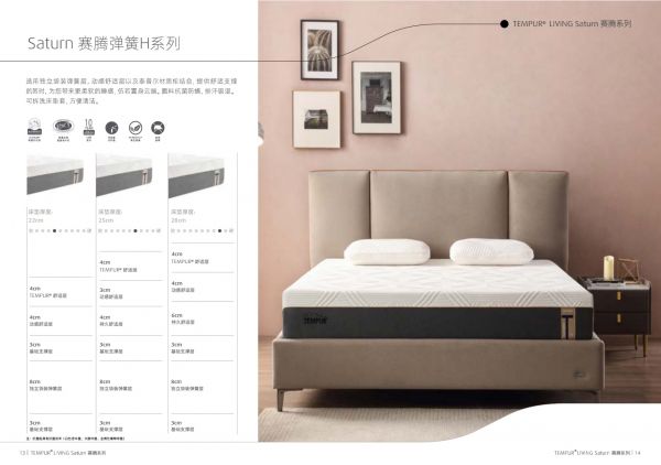 同时为了迎合喜欢弹簧床垫睡感的人群,泰普尔还相应推出了应用“独立袋装弹簧层+动感舒适层+泰普尔材质舒适层”的saturn 赛腾弹簧H系列以及mercurie 麦凯瑞弹簧H系列。不同于当今市面上支撑性强、抗干扰能力差的传统连接式弹簧。弹簧H系列所采用的独立袋装弹簧,每一个弹簧体均可单独运作,点状伸缩,独立支撑,分散压力并且抗干扰性强,即使床上有人翻身也只会产生轻微的震动。搭配上泰普尔材质特有的慢回弹特性,可以有效吸收翻动带来的反作用力。躺上去后无论如何翻动,身体和床垫之间都不会产生缝隙,感受如云朵般的包裹感,享受一整晚的安稳好眠。