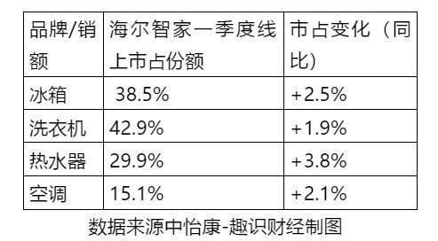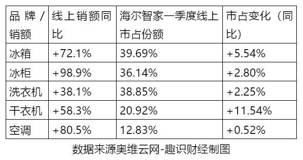 参照第三方平台奥维云网数据,一季度海尔智家主要品类,不仅实现了线上零售额高增,还迎来了市占份额的提升。