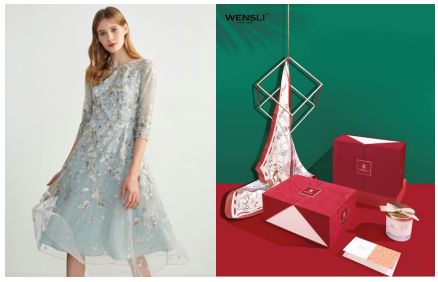 朗姿重工法式优雅连衣裙(左)、万事利香氛丝巾礼盒(右)