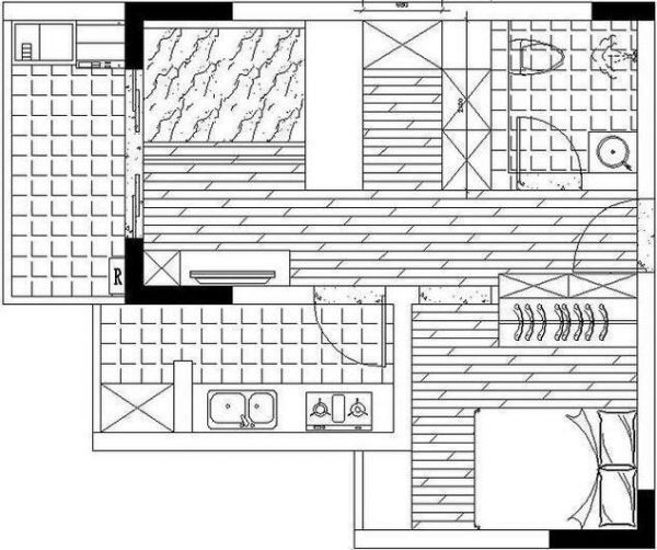 户型图,一室一厅一厨房的户型,最右边是入户进门处,在入户进门的两边,分别是卧室和卫生间。
