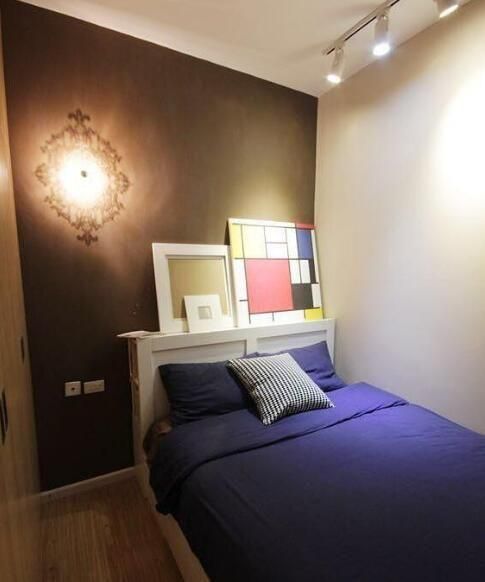 剩余的位置刚好摆上一张双人床,深色的床头墙与深蓝色的床上四件套,让卧室更安静,营造非常适合休息的环境。