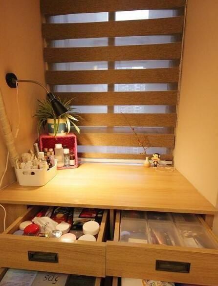 床对面是采光窗户,一点点的位置也得利用起来,不仅是自己的工作书桌,也是自己的梳妆台。