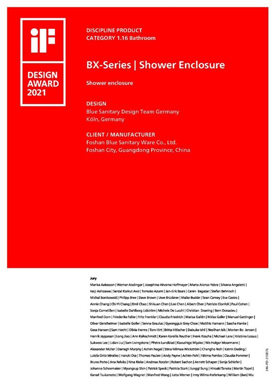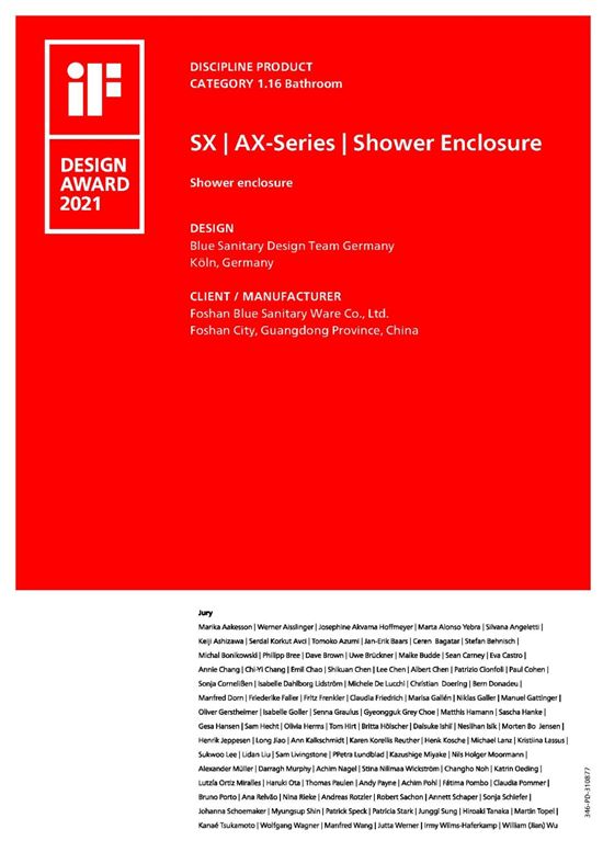 理想卫浴获得2021年iF设计奖的产品分别是BX、SX | AX系列淋浴房,评选委员会对这两款淋浴房给予了高度的评价。